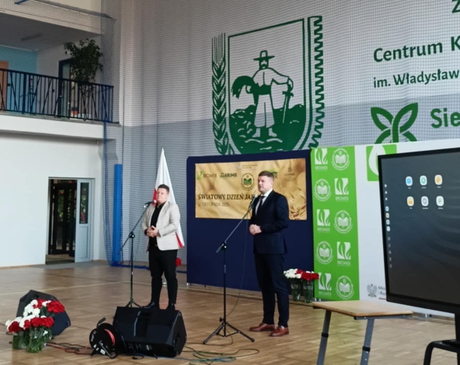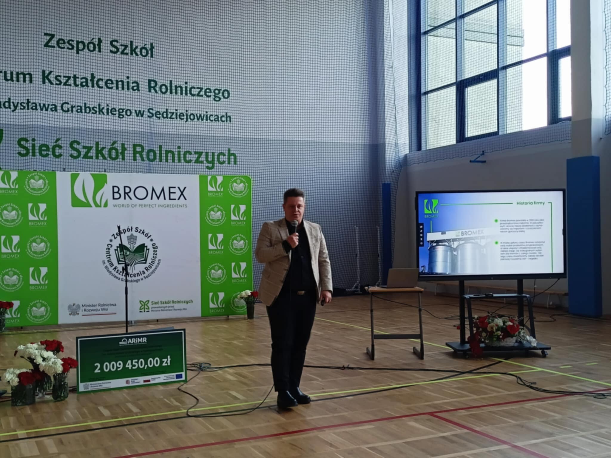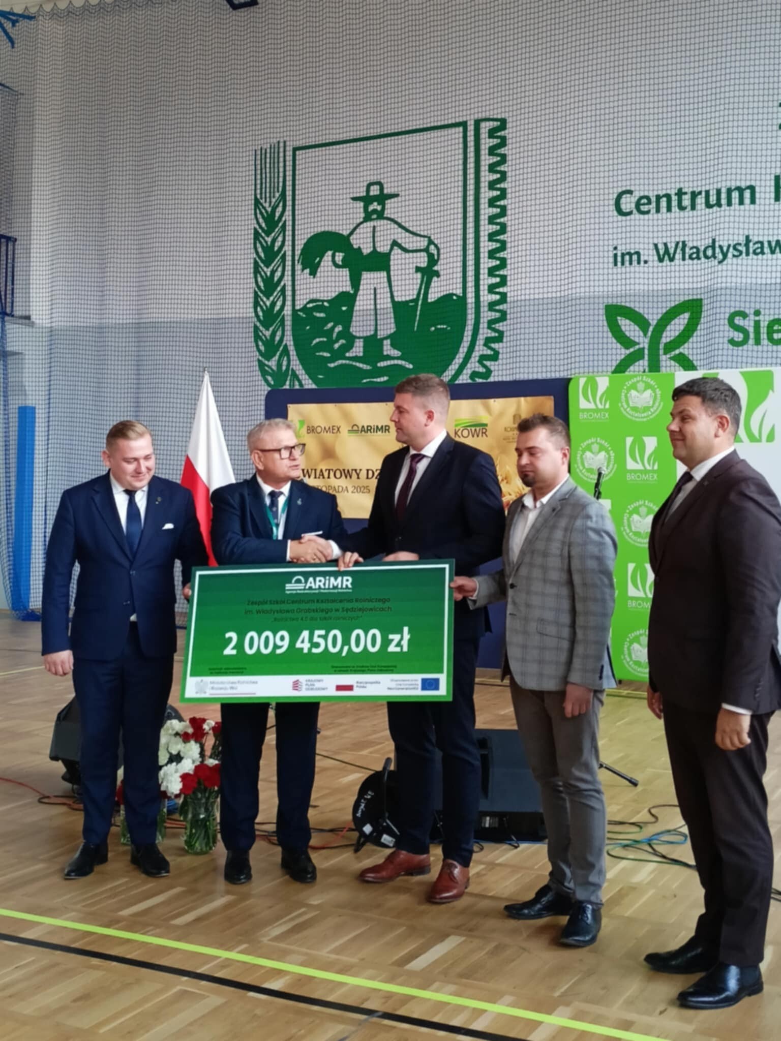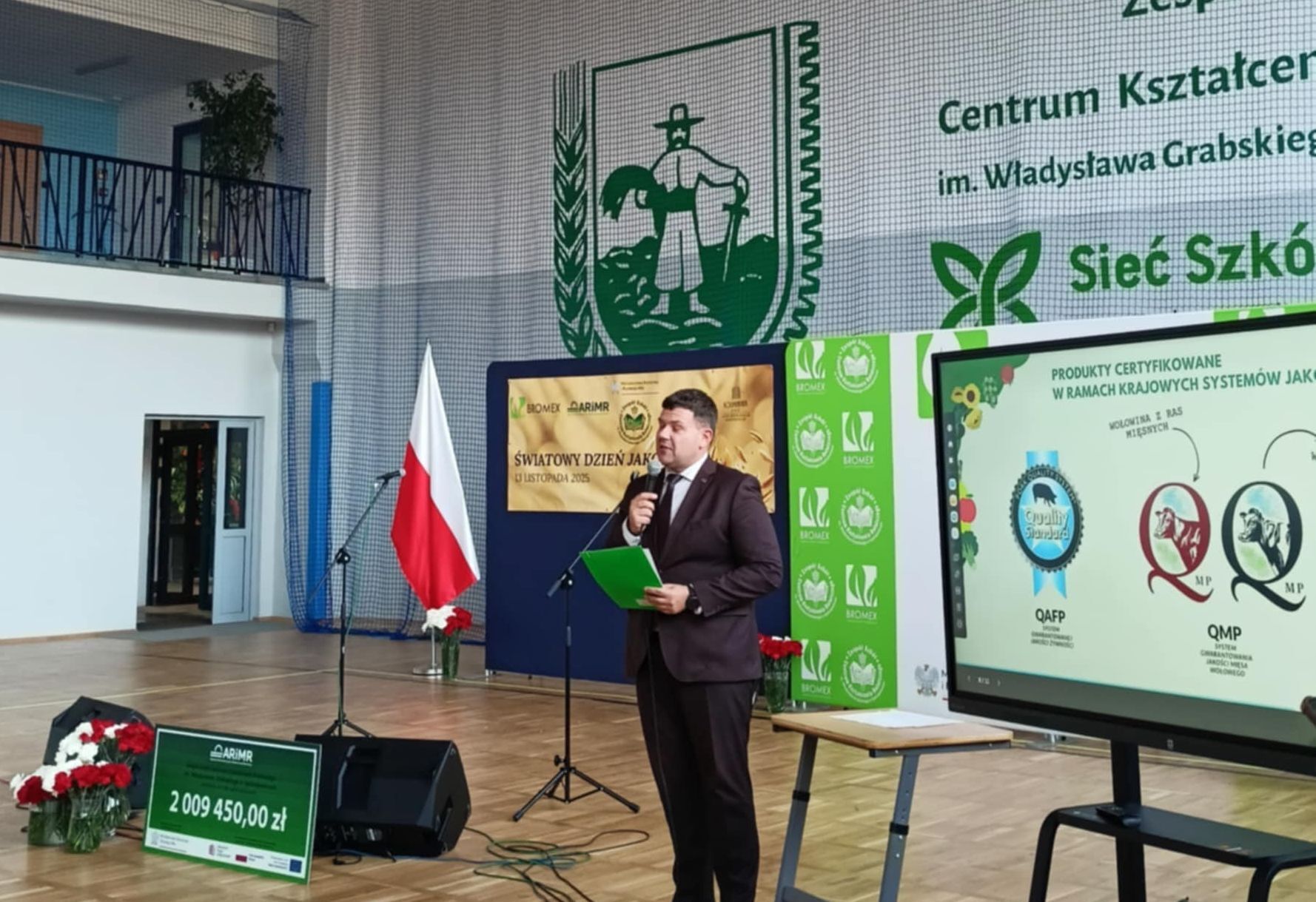 Tomasz Niedziałek reprezentujący Wiceministra Rolnictwa i Rozwoju Wsi Pana Adama Nowaka wraz z Panem Andrzejem Stępniem przekazali czek o wartości 2 009 450,00 zł na doposażenie materiałów naukowo-dydaktycznych w zakresie Rolnictwa 4.0 dla szkół rolniczych w ramach środków Krajowego Planu Odbudowy i Zwiększania Odporności.